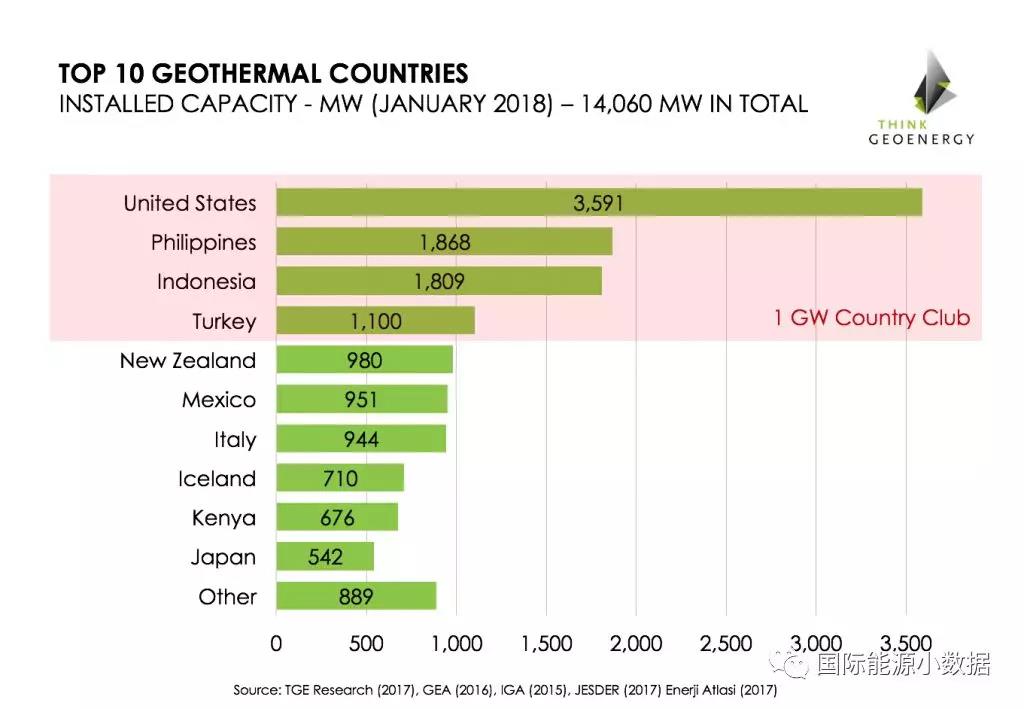 至此,2017年底全球地?zé)嵫b機(jī)達(dá)到14,060兆瓦,排在前10位的地?zé)岚l(fā)電裝機(jī)國家是:美國(3,591兆瓦)、菲律賓(1,868兆瓦)、印度尼西亞(1,809兆瓦)、土耳其(1,100兆瓦)、新西蘭(980兆瓦)、墨西哥(951兆瓦)、意大利(944兆瓦)、冰島(710兆瓦)、肯尼亞(676兆瓦)、日本(542兆瓦)。