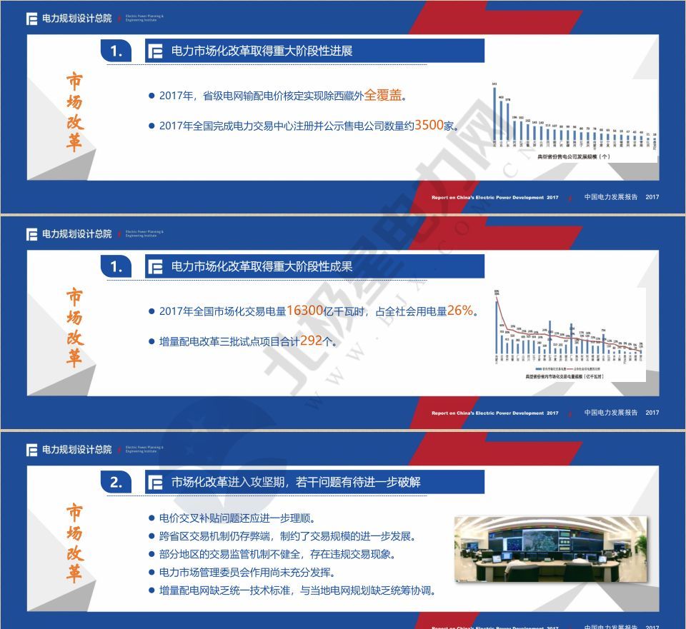 《報(bào)告》分十個(gè)篇章,從發(fā)展環(huán)境、需求分析、電源發(fā)展、電網(wǎng)發(fā)展、供需形勢(shì)、電力技術(shù)、電力經(jīng)濟(jì)、電力改革、政策解讀、熱點(diǎn)研究等多個(gè)方面對(duì)2017年我國(guó)電力發(fā)展?fàn)顩r進(jìn)行全面梳理、綜合歸納,分析預(yù)測(cè)了未來(lái)三年電力需求水平,并在此基礎(chǔ)上提出了各類電源、各級(jí)電網(wǎng)發(fā)展展望;深入解讀了過(guò)去一年重點(diǎn)行業(yè)政策及電價(jià)政策;在全面總結(jié)電力體制改革進(jìn)展的基礎(chǔ)上,分析展望了近期改革重點(diǎn);在總結(jié)上年度電源電網(wǎng)造價(jià)水平基礎(chǔ)上,對(duì)未來(lái)三年電力工程造價(jià)變化趨勢(shì)進(jìn)行了分析判斷;以專題文章形式深入剖析了新能源消納、電力現(xiàn)貨市場(chǎng)建設(shè)等當(dāng)前電力行業(yè)熱點(diǎn)焦點(diǎn)問(wèn)題。