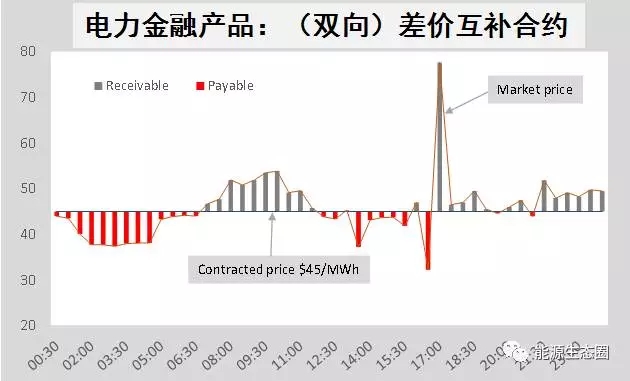 如果合同約定的時(shí)間是明年1月份,等到明年1月份,如果實(shí)時(shí)的電價(jià)比最初合同定的價(jià)格高,那么這時(shí)電力市場(chǎng)的價(jià)格減去合同價(jià)格的差價(jià)(圖中45澳元之上的灰色柱狀),乘上10兆瓦,就是發(fā)電方每小時(shí)給售電方的應(yīng)付款。如果實(shí)時(shí)電價(jià)低于合同價(jià)格,則反過(guò)來(lái)是售電方給發(fā)電方補(bǔ)償差價(jià)(圖中45澳元之下的紅色柱狀)。一個(gè)月下來(lái),差價(jià)合同的收入與支出抵消實(shí)時(shí)電價(jià)的波動(dòng),其凈結(jié)果是這10兆瓦在1月份的平均價(jià)是合同每兆瓦小時(shí)45澳元,而不是實(shí)時(shí)電力市場(chǎng)的平均價(jià)。這就基本給基荷電廠提供了一個(gè)可預(yù)知的相對(duì)穩(wěn)定的收入。因?yàn)榛呻姀S有很大一部分穩(wěn)定的電量,將合同電價(jià)定得比電廠短期邊際高一點(diǎn)就有助于收回固定成本。發(fā)電企業(yè)參與市場(chǎng)競(jìng)爭(zhēng),希望能夠固定這個(gè)價(jià)格,這樣就有一定的把握能保證每年開(kāi)工資、交貸款和營(yíng)運(yùn)開(kāi)支。當(dāng)零售商進(jìn)入市場(chǎng)后,它與客戶確定好銷售價(jià)格卻面臨購(gòu)電成本的不確定性,也會(huì)有降低市場(chǎng)風(fēng)險(xiǎn)的需求。雙向差價(jià)合同的作用就是讓發(fā)電方和售電方都可以規(guī)避實(shí)時(shí)電力價(jià)格風(fēng)險(xiǎn)。