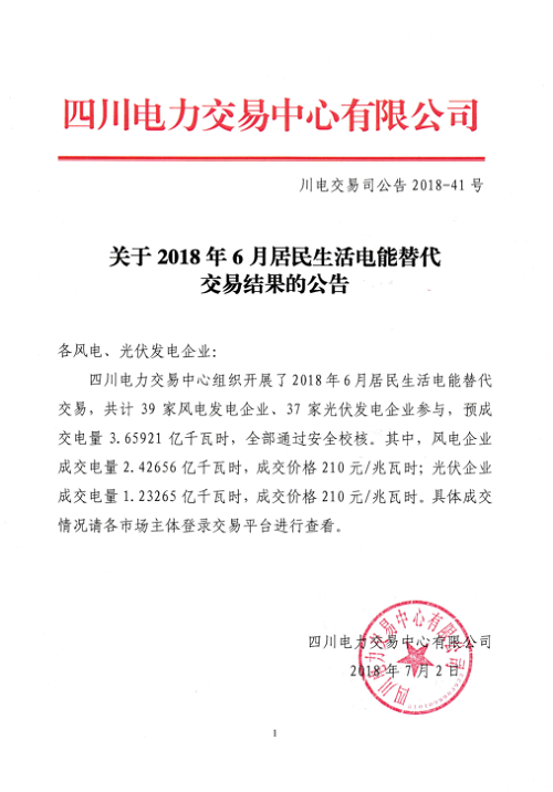 四川2018年6月居民生活電能替代交易 預(yù)成交電量3.65921億千瓦時(shí)