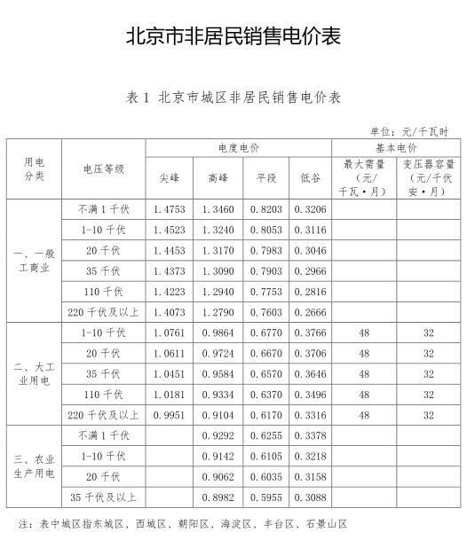 北京市發(fā)改委日前發(fā)布了《關(guān)于降低本市一般工商業(yè)銷售電價有關(guān)問題的通知》,2018年9月1日起,北京市城區(qū)一般工商業(yè)用戶電度電價每千瓦時下調(diào)3.67分;本市郊區(qū)(含北京經(jīng)濟技術(shù)開發(fā)區(qū))一般工商業(yè)用戶電度電價每千瓦時下調(diào)5.56分。同時,北京市發(fā)改委再次調(diào)整本市輸配電價有關(guān)問題,自2018年9月1日起,2017-2019年北京電網(wǎng)輸配電價中一般工商業(yè)及其他用戶電度電價每千瓦時降低4.29分。調(diào)后具體標準見附件。