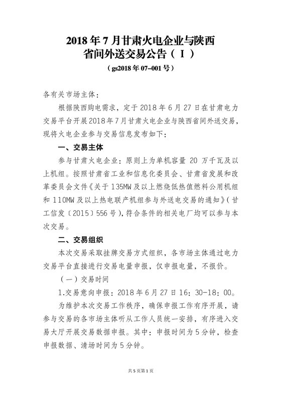 甘肅電力交易中心日前發(fā)布了《2018年7月甘肅外送陜西交易公告》,甘肅火電企業(yè)、新能源企業(yè)與陜西省間外送交易采用掛牌交易方式,本次火電