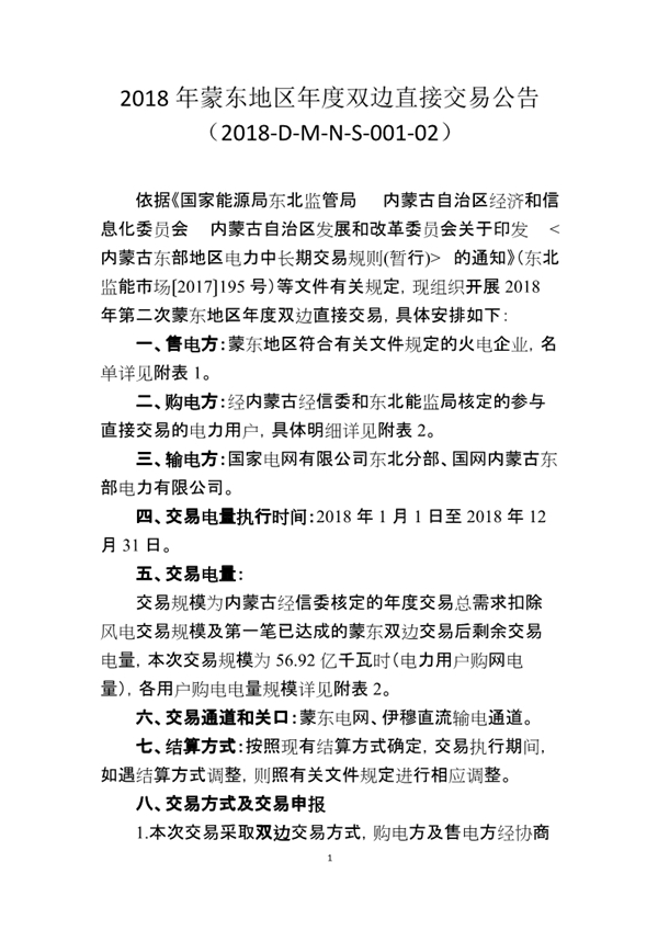 北京電力交易中心日前發(fā)布了《2018年蒙東地區(qū)年度雙邊直接交易公告》,現(xiàn)組織開(kāi)展2018年第二次蒙東地區(qū)年度雙邊直接交易。交易電量:交易規(guī)模為內(nèi)蒙古經(jīng)信委核定的年度交易總需求扣除風(fēng)電交易規(guī)模及第一筆已達(dá)成的蒙東雙邊交易后剩余交易電量,本次交易規(guī)模為56.92億千瓦時(shí)(電力用戶購(gòu)網(wǎng)電量),各用戶購(gòu)電電量規(guī)模詳見(jiàn)附表2。