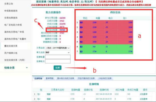 c)掛牌時,如果“未掛出電量”為0,則不能進行掛牌,如果登陸方電量已經(jīng)全部成交完成,則無法再參與本次交易;如果登陸方電量還在等待摘牌,則需要先“點擊撤單”,然后再重新掛牌。