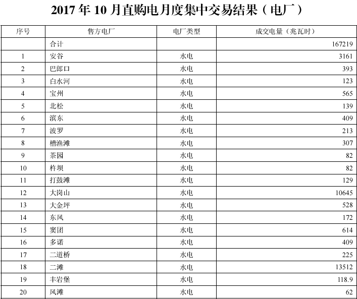 2017年9月27日四川電力交易中心公布10月份月度直購電及富余電量交易結(jié)果。2017年10月份月度直購電交易共102家用電企業(yè)和144家發(fā)電企業(yè)成交,成交電量167219兆瓦時,水電成交均價為188 65元 兆瓦時。2017年10月份