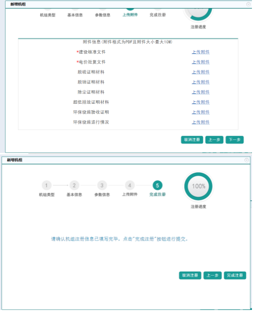 上傳注冊機組所需要的附件信息(附件類型必須為PDF格式),其中“建設核準文件”、“電價批復文件”為必須上傳附件。然后點擊【下一步】完成此機組的注冊。