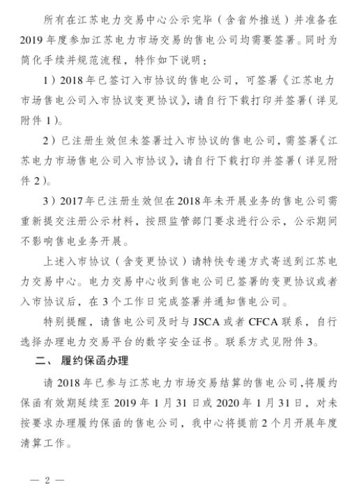 2018年已參與江蘇電力市場交易結(jié)算的售電公司,將履約保函有效期延續(xù)至2019年1月31日或2020年1月31日,對未按要求辦理履約保函的售電公司,江蘇電力交易中心將提前2個月開展年度清算工作。