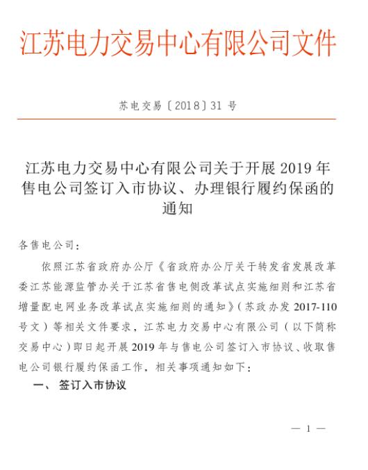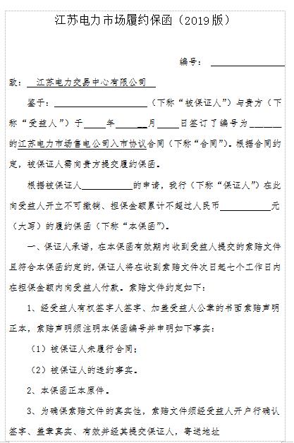 擬參與2019年江蘇電力市場交易的售電公司,需在與用戶綁定工作開展前及時辦理銀行履約保函,履約保函有效期不得早于2020年1月31曰。