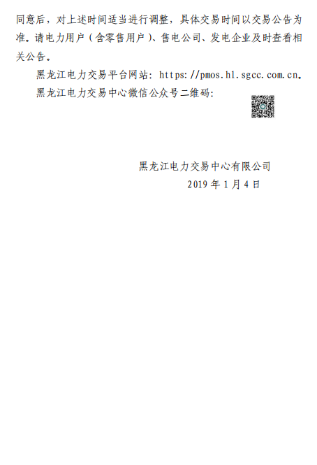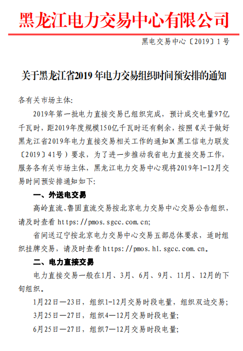 黑龍江電力交易中心發(fā)布了《關(guān)于黑龍江省2019年電力交易組織時(shí)間預(yù)安排的通知》