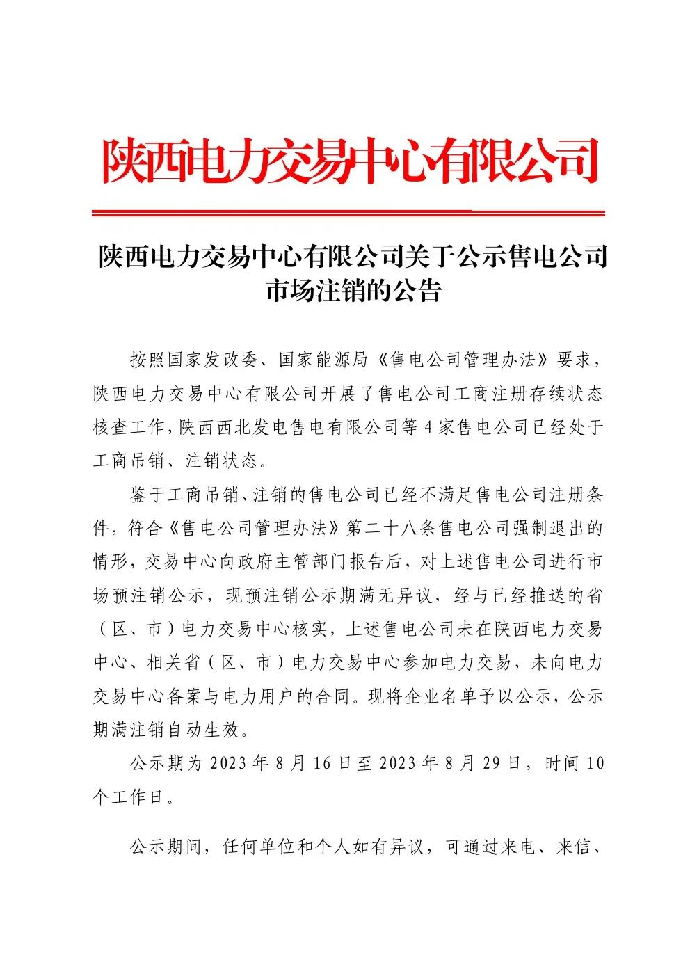 陜西電力交易中心近日發(fā)布關(guān)于公示售電公司市場注銷的公告,詳情如下: