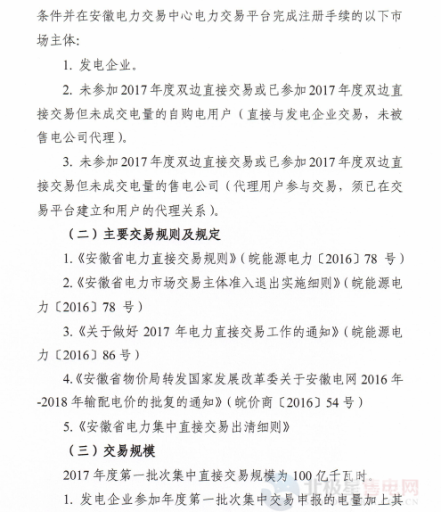 關于開展安徽省2017年度電力集中直接交易的市場公告今日發(fā)布,一起來看公告全文: