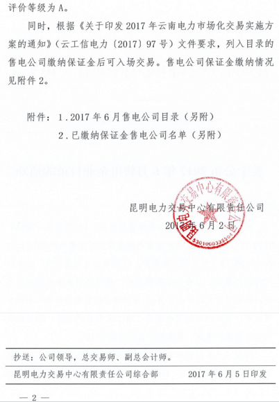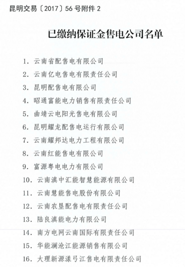 昆明電力交易中心發(fā)布了《關(guān)于公布2017年6月售電企業(yè)目錄的通知》,包含4月新增注冊11家售電公司售電公司目錄已有43家,已繳納保證金售電公司有16家。詳情如下: