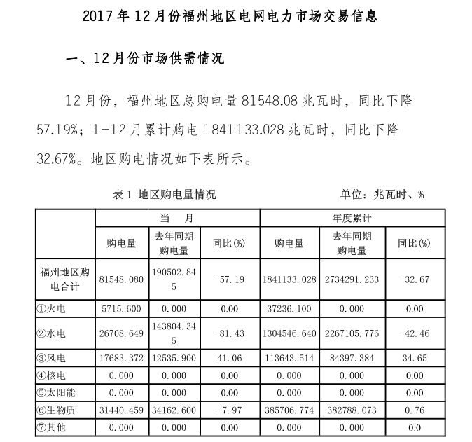 《2017年12月份福州地區(qū)電網(wǎng)電力市場交易信息》