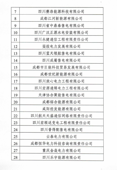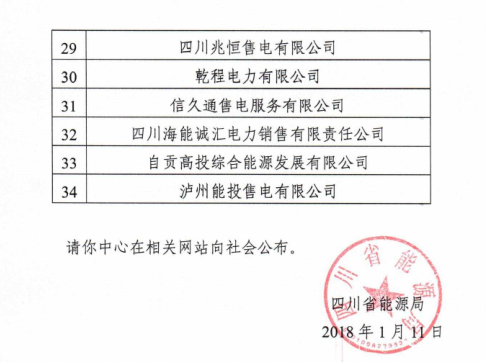 四川省能源局日前發(fā)布了《關(guān)于同意第四批售電公司納入售電側(cè)市場主體目錄的函》,經(jīng)過現(xiàn)場核驗,其中3家售電公司發(fā)現(xiàn)問題,截止公示結(jié)束,3家售電公司全部完成相應(yīng)整改,同意34家售電公司予以備案,納入主體目錄。詳情如下: