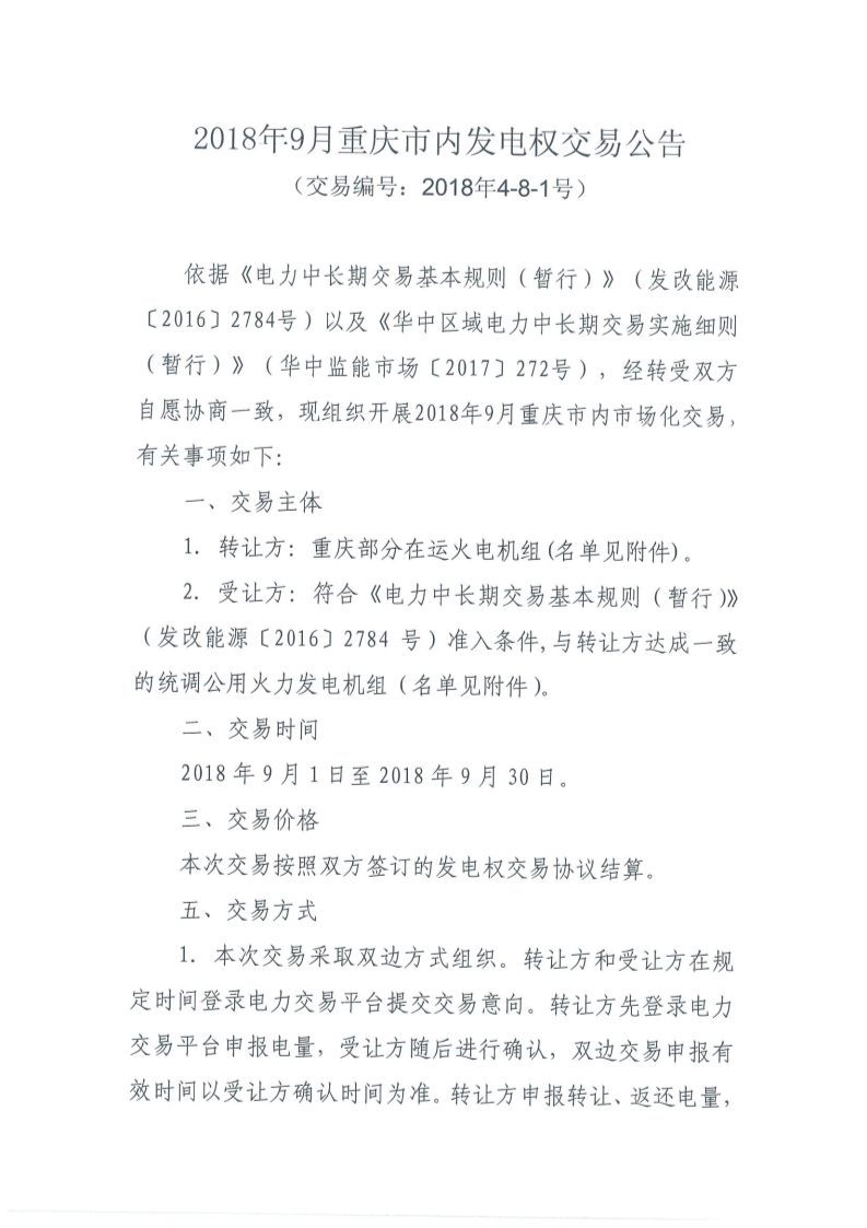 重慶開展2018年9月市內(nèi)發(fā)電權(quán)交易