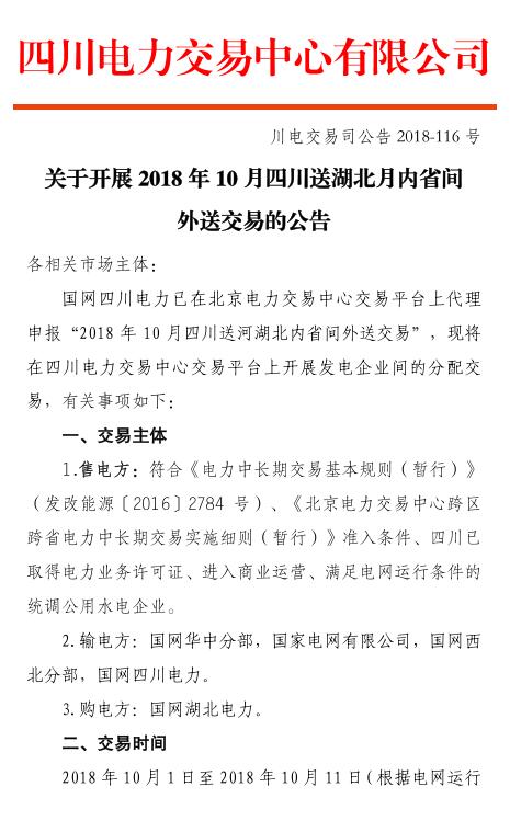 2018年10月四川送湖北月內(nèi)省間外送交易:交易電量0.25億千瓦時(shí)