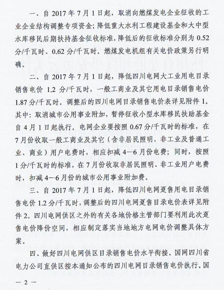 從四川省發(fā)展和改革委員會(huì)獲悉,關(guān)于降低四川電網(wǎng)目錄銷售電價(jià)合理調(diào)整電價(jià)結(jié)構(gòu)有關(guān)事項(xiàng)的通知今日發(fā)布,自2017年7月1日起,降低四川電網(wǎng)大工業(yè)用電目錄銷售電價(jià)1 2分 千瓦時(shí),一般工商業(yè)及其它用電目錄銷售電價(jià)