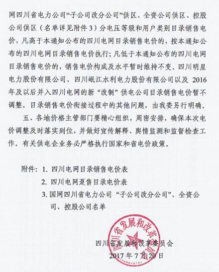 從四川省發(fā)展和改革委員會(huì)獲悉,關(guān)于降低四川電網(wǎng)目錄銷售電價(jià)合理調(diào)整電價(jià)結(jié)構(gòu)有關(guān)事項(xiàng)的通知今日發(fā)布,自2017年7月1日起,降低四川電網(wǎng)大工業(yè)用電目錄銷售電價(jià)1.2分/千瓦時(shí),一般工商業(yè)及其它用電目錄銷售電價(jià)1.87分/千瓦時(shí)。自2017年7月1日起,降低四川電網(wǎng)躉售用電目錄銷售電價(jià)1.2分/千瓦時(shí)。詳情如下: