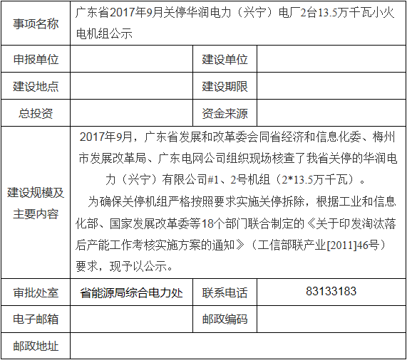 ,近日,廣東省發(fā)改委發(fā)布了2017年9月關(guān)停華潤電力(興寧)電廠2臺(tái)13 5萬千瓦小火電機(jī)組公示,詳情如下:本公示的期限為9月19日至9月25日。公民、法人和其他經(jīng)濟(jì)組織在公示期限屆滿后五個(gè)工作日內(nèi),對(duì)本行政審批事