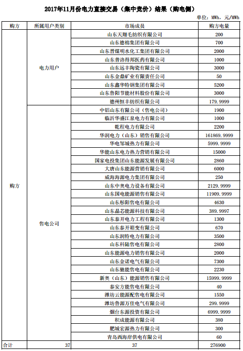 山東電力交易中心發(fā)布關(guān)于2017年11月份電力直接交易(集中競(jìng)價(jià))成交結(jié)果的公告,無(wú)約束交易結(jié)果經(jīng)山東電力調(diào)度控制中心安全校核后,確認(rèn)24家統(tǒng)調(diào)發(fā)電企業(yè)(40臺(tái)發(fā)電機(jī)組)與9家電力用戶(hù)及28家售電公司達(dá)成交易電量