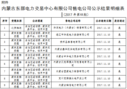 內(nèi)蒙古東部電力交易中心日前發(fā)布了2017年第三期、第四期售電公司公示結(jié)果明細表,此次共有來自北京推送和蒙東直接受理兩種來源,兩批次共有37家售電公司在名單內(nèi)。詳情如下: