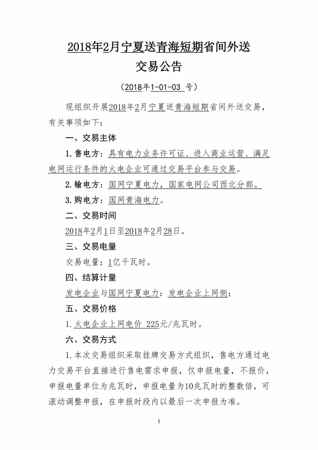 寧夏電力交易中心日前發(fā)布了《2017年2月送青海交易公告(火電)》的通知,通知中稱,將于2018年2月1日-28日舉行2018年2月寧夏送青海短期省間外送交易,交易電量1億千瓦時(shí),詳情如下: