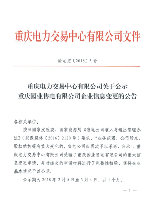 重慶電力交易中心還對重慶園業(yè)售電有限公司企業(yè)信息變更進行了公示,公示期同樣為一個月。