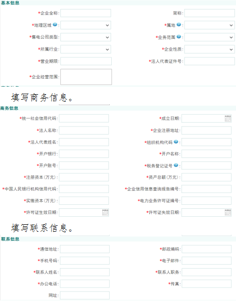 進(jìn)入市場(chǎng)成員基本信息菜單后,填寫基本信息?;拘畔⒅衅髽I(yè)經(jīng)營(yíng)范圍應(yīng)包括“售電”或“電力銷售”。