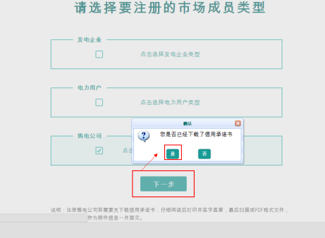 選擇售電公司類型,下載信用承諾書。注冊(cè)售電公司前需要先下載信用承諾書,仔細(xì)閱讀后打印并簽字蓋章,最后掃描成PDF格式文件,提交注冊(cè)信息時(shí)作為附件信息一并提交。