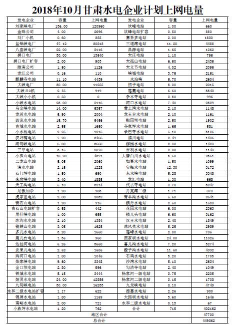 甘肅2018年10月電量交易計劃:凈送出交易電量22.0021億千瓦時