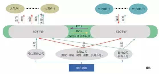 為充分利用互聯(lián)網(wǎng)的零距離、零時(shí)差的資源共享優(yōu)勢(shì),在建立中小電力用戶的B2C平臺(tái)以及與大用戶之間的B2B平臺(tái)后,通過C2B對(duì)兩個(gè)平臺(tái)進(jìn)行融合,以金融為核心,以供應(yīng)鏈為紐帶,以能源服務(wù)為支持,構(gòu)建融合多產(chǎn)業(yè)的互聯(lián)互通生態(tài)系統(tǒng)。(見圖6)