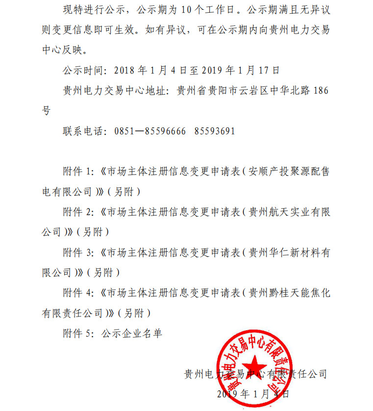 貴州電力交易中心日前發(fā)布了《關(guān)于安順產(chǎn)投聚源配售電有限公司等4家市場主體注冊信息變更公示的通知》,公示申請注冊信息變更的1家售電公司和3家電力用戶,公示期為2019年1月4日至1月17日,時間10個工作日。