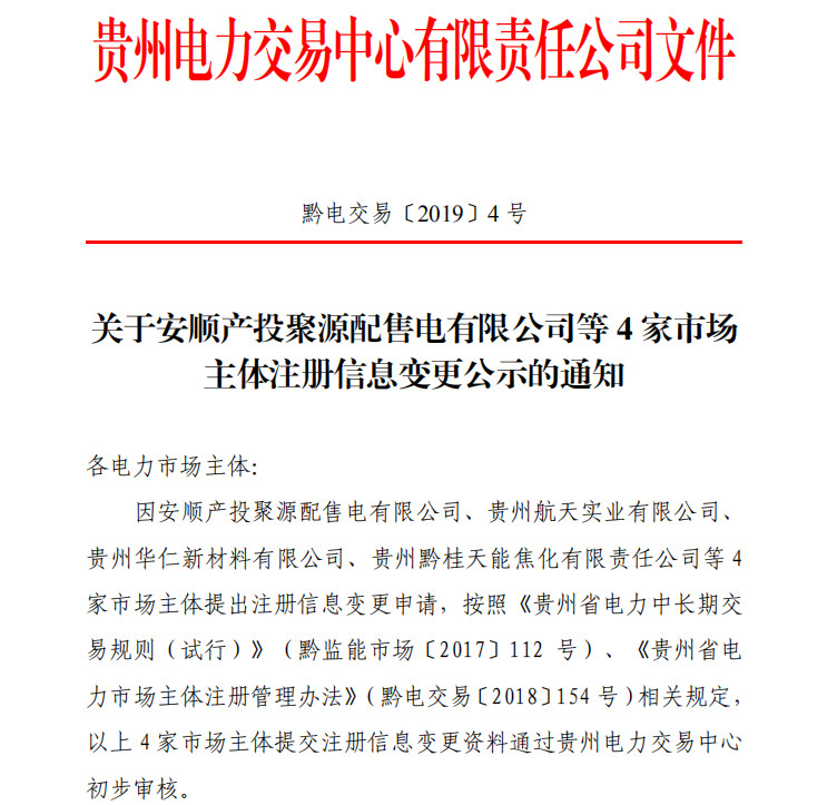 貴州發(fā)布了《關(guān)于安順產(chǎn)投聚源配售電有限公司等4家市場主體注冊信息變更公示的通知》