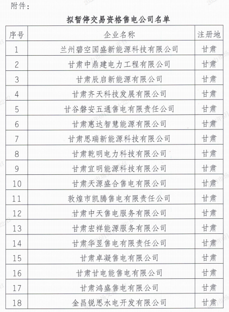 根據(jù)國家發(fā)展改革委、國家能源局《售電公司管理辦法》(發(fā)改體改規(guī)﹝2021﹞1595號)第二十七條“連續(xù)12個月未進(jìn)行實(shí)際交易的售電公司,電力交易機(jī)構(gòu)征得地方主管部門同意后暫停其交易資格,重新參與交易前須再次進(jìn)行公示”之規(guī)定,甘肅電力交易中心有限公司對在甘肅電力交易平臺注冊的售電公司(含外省推送甘肅)實(shí)際參與甘肅電力市場交易情況進(jìn)行梳理,核實(shí)蘭州碧空國盛新能源科技有限公司等266家售電公司已連續(xù)12個月未進(jìn)行實(shí)際交易。經(jīng)國家能源局甘肅監(jiān)管辦公室同意,對上述266家售電公司參與甘肅電力市場交易資格啟動暫停程序,現(xiàn)予以公示。具體售電公司名單詳見附件。