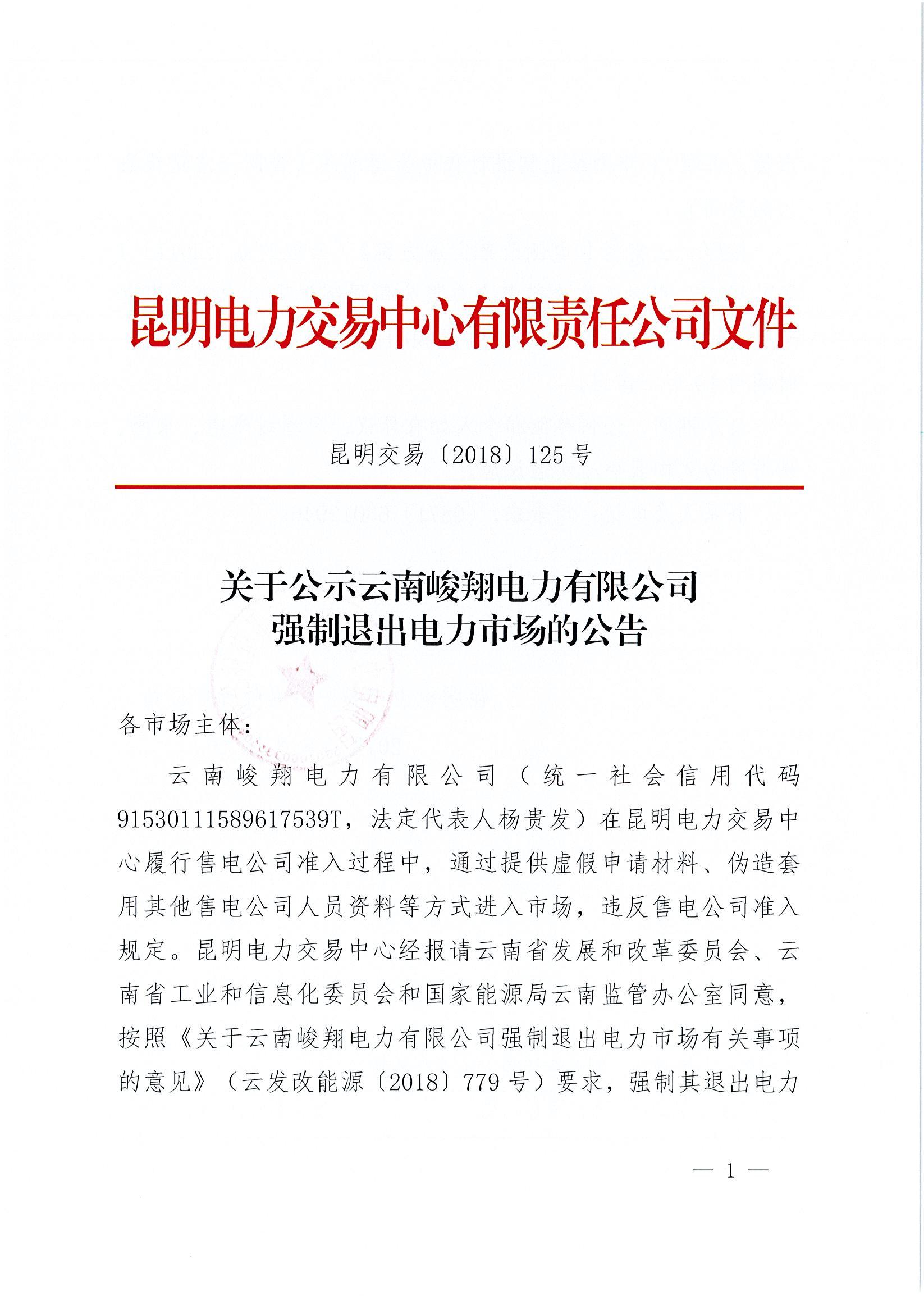 昆明電力交易中心日前發(fā)布了《關(guān)于公示強(qiáng)制退出云南峻翔電力有限公司的公告》,云南峻翔電力有限公司(統(tǒng)一社會信用代碼91530111589617539T,法定代表人楊貴發(fā))在昆明電力交易中心履行售電公司準(zhǔn)入過程中,通過提供虛假申請材料、偽造套用其他售電公司人員資料等方式進(jìn)入市場,違反售電公司準(zhǔn)入規(guī)定。