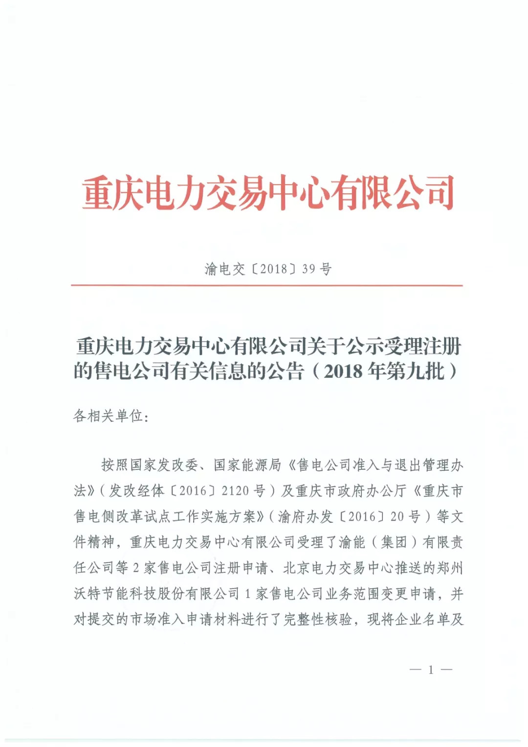 受理了渝能(集團)有限責任公司等2家售電公司注冊申請、北京電力交易中心推送的鄭州沃特節(jié)能科技股份有限公司1家售電公司業(yè)務(wù)范圍變更申請,并對提交的市場準入申請材料進行了完整性核驗,現(xiàn)將企業(yè)名單及基本情況予以公示。公示期為2018年9月10日至10月9日,共1個月。