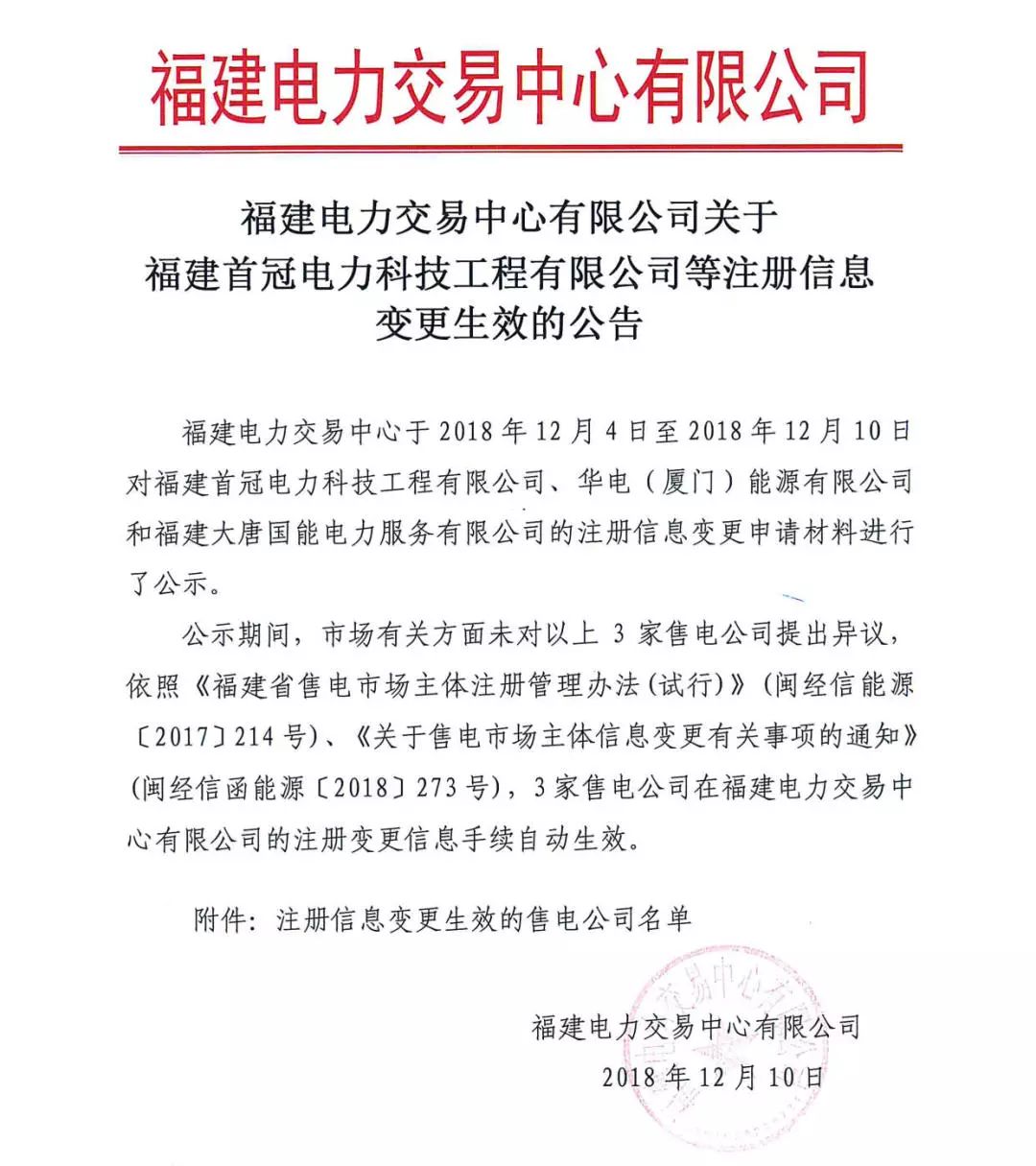 華電(廈門(mén))能源有限公司等3家售電公司注冊(cè)信息變更生效