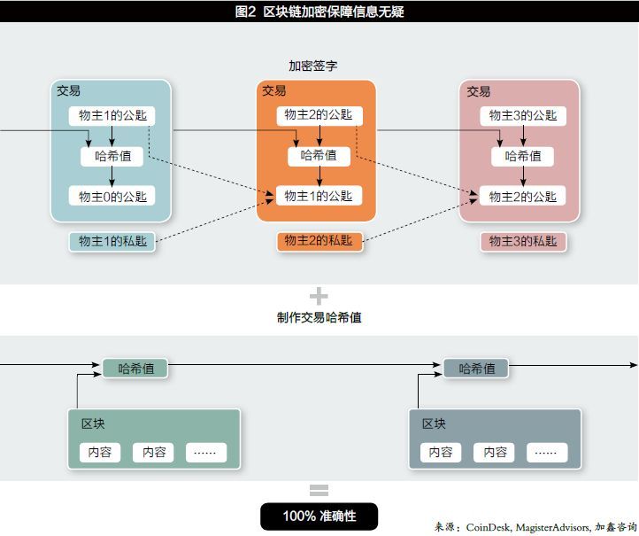 公私鑰匙、歷史時序、哈希值、隨機生成、高速網(wǎng)絡(luò),超大算力,當這些要素疊加在一起時,中本聰(Satoshi Nakamoto)和他的網(wǎng)絡(luò)伙伴就制造出可以顛覆中央集權(quán)控制的比特幣,其背后的核心技術(shù)便是區(qū)塊鏈。區(qū)塊鏈加密保障信息無疑的過程圖如2所示。