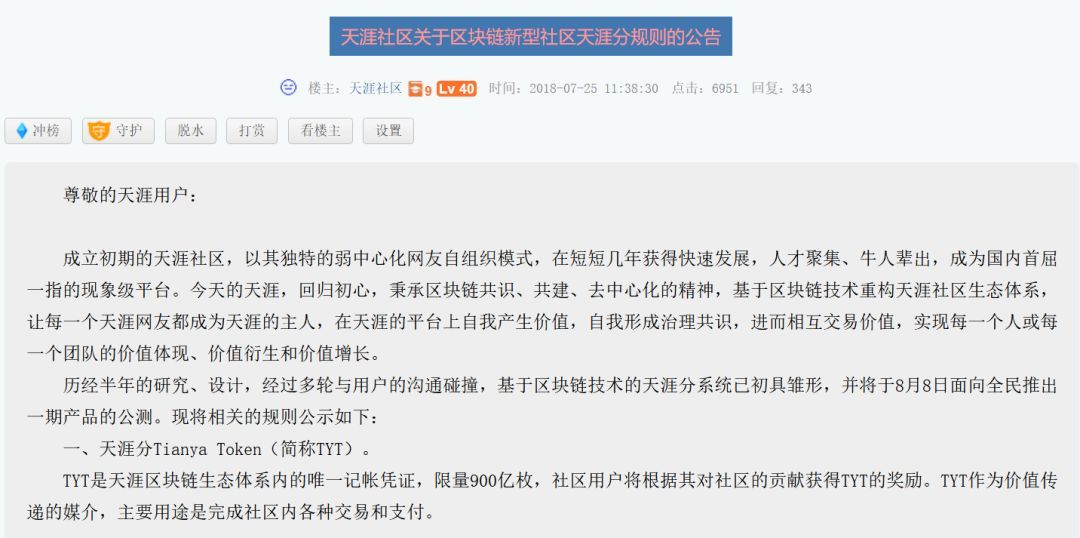 2018年7月25日的天涯公告引發(fā)不小的關注,天涯作為上古老牌社區(qū)通過區(qū)塊鏈來復興,看起來過于突兀。