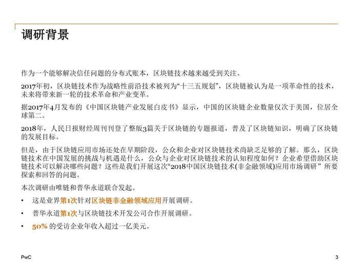 該調(diào)查主要采用問卷調(diào)查形式,共收到130份問卷。問卷主要涉及對區(qū)塊鏈的認(rèn)識、對區(qū)塊鏈的應(yīng)用觀點和區(qū)塊鏈技術(shù)面臨的機遇和體驗等方面,受訪者覆蓋了IT、高科技產(chǎn)業(yè)、服務(wù)業(yè)等20個行業(yè)。