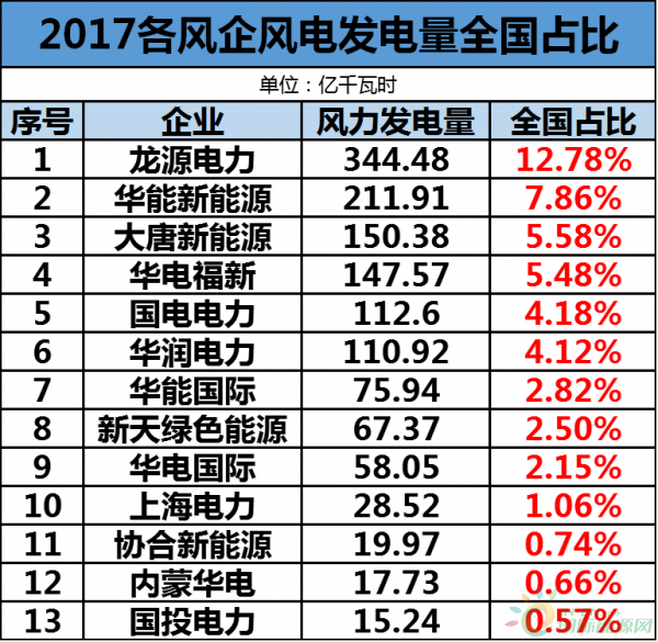 根據(jù)國家統(tǒng)計局?jǐn)?shù)據(jù),2017年全國風(fēng)力絕對發(fā)電量達(dá)到了2695億千瓦時。通過下表我們一起來看下這些企業(yè)的風(fēng)力發(fā)電量在全國的占比: