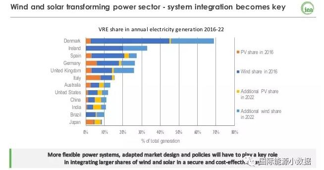 根據(jù)國際能源署(IEA)在最新版的世界能源展望中的情景分析,2022年各國間歇性可再生能源(風電、光伏)發(fā)電的比例可望達到以下的規(guī)模: