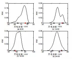 圖 4  某日6:00、12:00、18:00和24:00的提前1小時(shí)總體發(fā)電功率預(yù)測概率密度和實(shí)測功率(實(shí)線:預(yù)測概率密度函數(shù);星型標(biāo)記:實(shí)測風(fēng)電功率;三角標(biāo)記:80%置信度水平的預(yù)測區(qū)間上、下限)