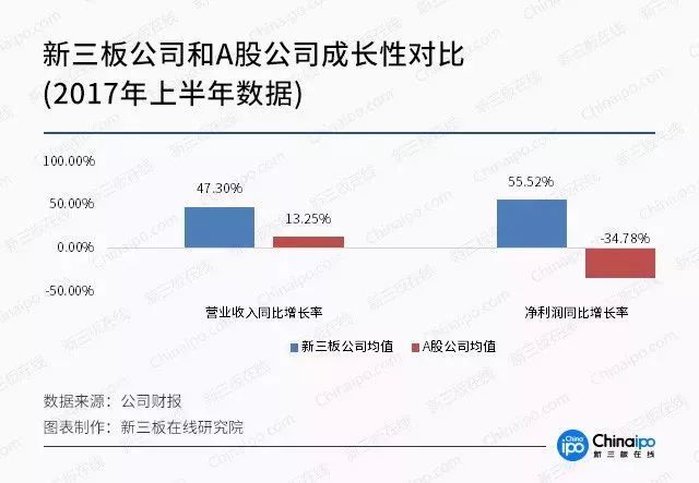 對(duì)比新三板公司和A股公司可以發(fā)現(xiàn),無(wú)論是最近三年的復(fù)合增長(zhǎng)率還是2017年上半年的同比增長(zhǎng)率,新三板公司都要強(qiáng)于A股公司,尤其是在凈利潤(rùn)的增幅方面新三板公司更是勢(shì)頭強(qiáng)勁,將A股公司遠(yuǎn)遠(yuǎn)甩在了身后。