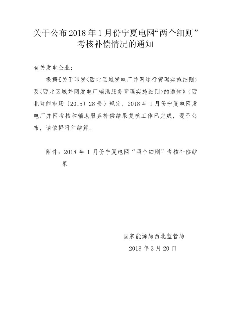 根據(jù)《關(guān)于印發(fā)<西北區(qū)域發(fā)電廠并網(wǎng)運(yùn)行管理實(shí)施細(xì)則>及<西北區(qū)域并網(wǎng)發(fā)電廠輔助服務(wù)管理實(shí)施細(xì)則>的通知》(西北監(jiān)能市場〔2015〕28號(hào))規(guī)定,2018年1月份寧夏電網(wǎng)發(fā)電廠并網(wǎng)考核和輔助服務(wù)補(bǔ)償結(jié)果復(fù)核工作已完成,現(xiàn)予公布,請(qǐng)依據(jù)附件結(jié)算。