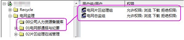 和“電網(wǎng)總監(jiān)組”都對00和01文件夾有瀏覽和下載的權(quán)限,即所有的電網(wǎng)片區(qū)經(jīng)理和電網(wǎng)總監(jiān)都可以查看公司人力資源備援庫和電網(wǎng)部通報與紀(jì)要,如下圖所示。