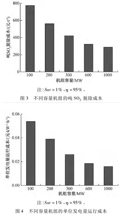 設(shè)定含硫量為1%,脫硫效率為95%,機組容量分別為100,200,300,600,1000WM,年運行時間為5000h,分別計算其噸SO2脫除成本、單位發(fā)電量運行成本和年減排量。如圖3、圖4所示,大容量機組有助于降低噸SOz脫除成本及單位發(fā)電量運行成本。隨著機組容量的增加,噸SOz脫除成本逐漸減小,是因為脫硫設(shè)施總運行成本和年SOz減排量都呈增長趨勢,但幅度不同,導致噸SO2減排成本降低。在脫硫效率和含硫量一定時,隨著機組容量提升,單位發(fā)電量運行成本逐漸減少,主要是因為隨著機組規(guī)模增大,單位容量投資成本逐漸減少;脫硫電耗率降低,導致電耗成本減少;鍋爐熱效率升高,發(fā)電標煤耗降低,使得石灰石耗量減少,成本隨之降低;水耗量雖逐漸增大,但單位發(fā)電量的成本與規(guī)模效應(yīng)有關(guān),呈減少趨勢??偠灾?,機組規(guī)模越大,脫硫設(shè)施單位發(fā)電量運行成本越低。
