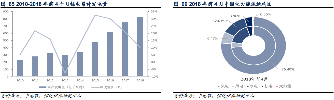 現(xiàn)狀:投資與裝機(jī)雙重提升,行業(yè)整體迎來復(fù)蘇 2018 年 1-4 月核電發(fā)電量為 827 億千瓦時(shí),同比增長 10.2%。核電發(fā)電量占社會總體發(fā)電量 3.96%,2017 世界核電發(fā)電占比為 10.6%,核電發(fā)電仍存在很大的空間。