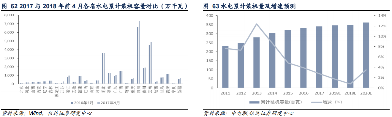 2018 年 1-4 月新增裝機(jī)容量為 135 萬千瓦,同比下降 64.06%。新增裝機(jī)量主要集中在四川、云南、廣東三個(gè)省份,主要原因是 2017 年下半年和 2018 年上半年,四川省和云南省分別逐步投運(yùn)了 3 座大渡河流域和 4 座瀾滄江流域的水電站。根據(jù)《2018 年能源工作指導(dǎo)意見通知》積極推進(jìn)已開工水電項(xiàng)目建設(shè),年內(nèi)計(jì)劃新增裝機(jī)規(guī)模約 600 萬千瓦。扎實(shí)推進(jìn)金沙江、雅礱江、大渡河、黃河上游等水電基地建設(shè),年內(nèi)計(jì)劃開工建設(shè)金沙江拉哇水電站。2018 年計(jì)劃投運(yùn)的水電站大多數(shù)在下半年完工,我們預(yù)計(jì) 2018 年下半年新增裝機(jī)容量較上半年小幅度回升,年底累計(jì)裝機(jī)容量將達(dá)到 347.02 吉瓦,同比增速為 1.7%,新增裝機(jī)容量為 580 萬千瓦。