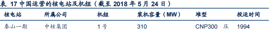 截至 2018 年 5 月,我國共有 14 個(gè)核電廠運(yùn)營 39 臺核電機(jī)組,總裝機(jī)容量為 3789 萬千瓦。截至 2018 年 5 月,在建核電廠 5 個(gè)包括在建機(jī)組 18 臺,裝機(jī)容量為 1998 萬千瓦。